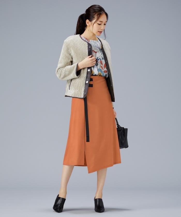 トレンドのラップ風スカートに華やかカラーが新登場!【商品説明】イレギュラーヘムデザインとフェイクレザーの配色ベルトが、今年らしいラップ風スカート。開閉は後ろのファスナーで、内側は縫い留められていて足がはだける心配がないのも魅力です。シンプルなニットやカットソーに合わせるだけで、たちまちコーディネートが今年らしくアップデートします。同型別素材のスカート(品番:SKWMHW0425)では、アイボリーとインディゴカラーをご用意しております。【素材】シルクのように柔らかな風合いが特徴のテンセルを使用。上品な印象のライトオレンジカラーに。>> 秋の旬スタイリング一覧はこちら