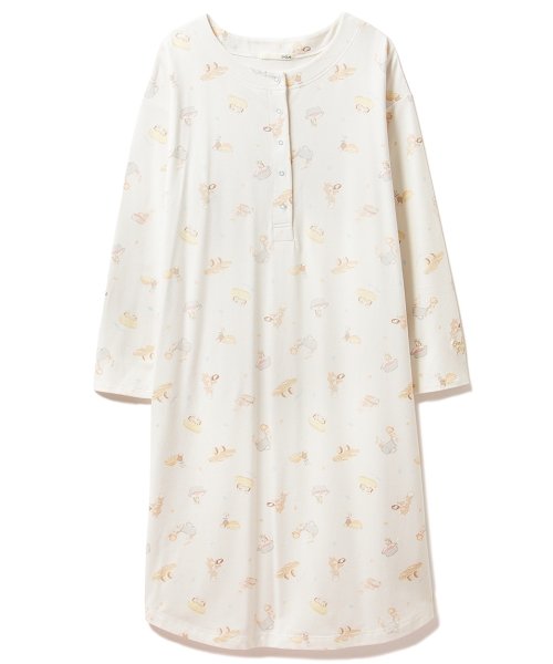 キッズ、ベビーとおそろいで楽しめる“アニマルクッキング柄”シリーズ。目玉焼きに、パン作り、かわいいハリネズミがクッキング帽をかぶって、朝食を用意している様子を描いています。おやすみ中も幸せな時間を楽しめる一枚に仕上げました。肌触りのやわらかな生地に、春をさきどりしたピンク系とミント系の淡い配色もポイントです。また、胸元はヘンリーネックデザインでヘルシーな印象です。