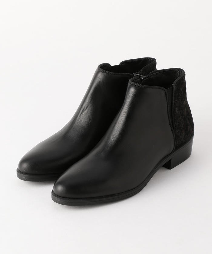 なめらかな光沢感を持つハラコ素材の風合いとレザーの異素材使いで仕上げたショートブーツ。オールブラックのシックなルックスに、ハラコのニュアンスのある素材感がさりげないアクセントを与えています。スタイリングを選ばず合わせやすい、シンプルかつスタイリッシュなデザインに仕上がっています。
