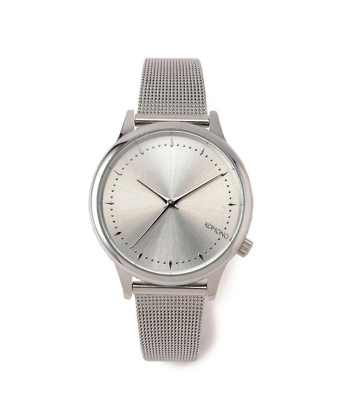 シルバーのメタリックな輝きが高級感を放つラウンドフェイスウォッチです。シンプルなデザインなのでオンオフ関係なくお使い頂け、さりげなくコーディネートを格上げしてくれるアイテム。小さなロゴ入り。