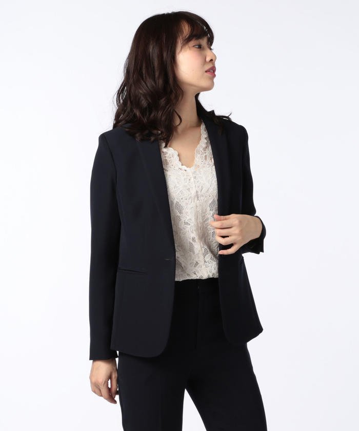 上質感が漂うバックサテン生地のテーラードジャケットは、ベーシックなデザインときれいなシルエットが魅力。細部は1つボタン、ノッチドラペル、センターベント、袖口スリットなどが特徴です。通勤からフォーマルなシーンまで対応し、幅広く活躍するアイテム。同シリーズのボトムを揃えるとセットアップスーツとして着用可能です。