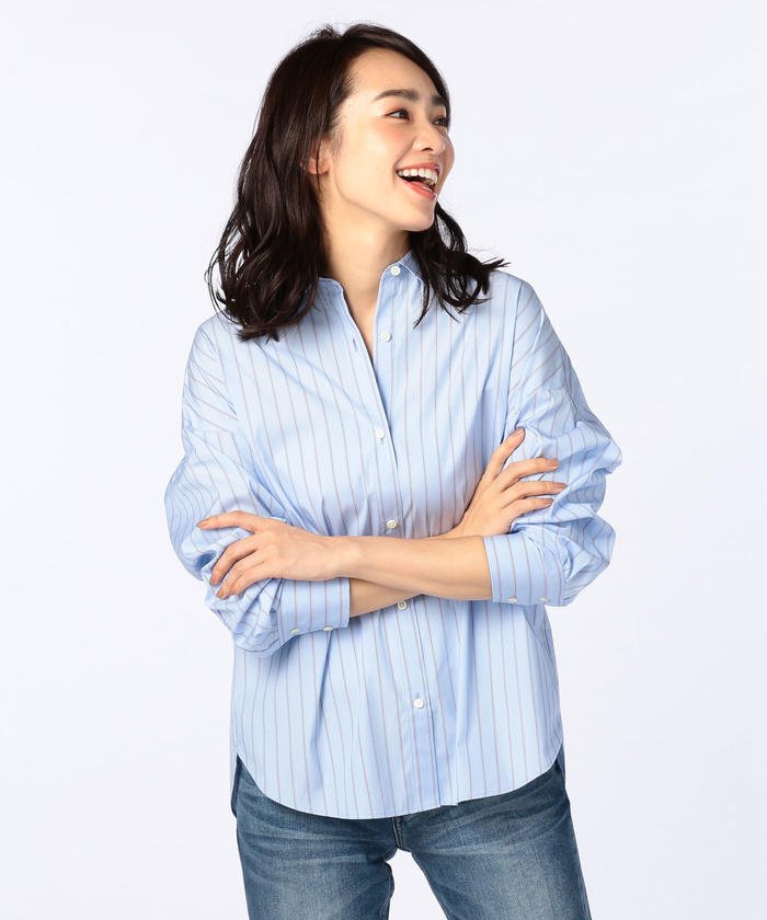 ドロップショルダーがリラックスした装いを演出するオーバーシルエットのカラーシャツ。小さな衿が女の子らしく、上のボタンを外して後ろに落とせばトレンドの抜け衿も楽しめます。後ろ裾にはスリットをセット。前だけをインにして後姿を印象づけたスタイリングもお勧めです。