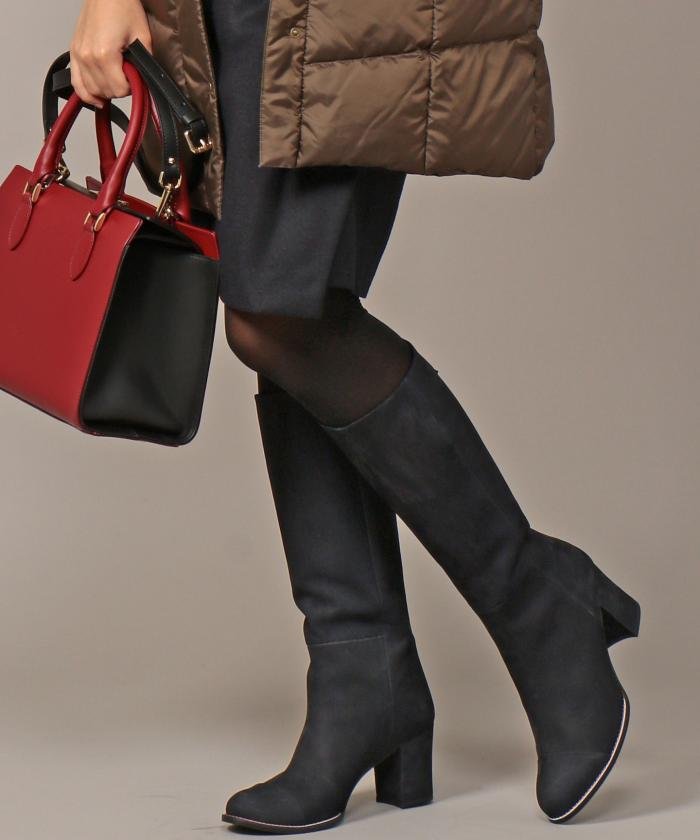 キレイめロングブーツです。今季のロングブーツはトレンドのガウチョやワイドパンツとも合わせやすいよう、従来よりもやや短め丈の今っぽい設定になっています。牛革スエードを使用しており、暖かみとぬくもり感に優れた大人っぽいブーツに仕上がっています。サイドの剥ぎ部分には表面にステッチが出ないよう、キレイめなデザインに仕上げました。