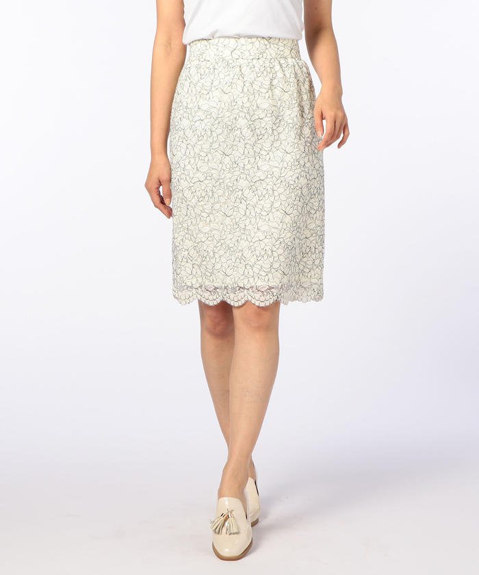 花柄の美しさを刺しゅうで引きたてたコードレース生地のタイトスカート。ハイウエストデザインとフェミニンなスカラップヘムが特徴で、着まわしやすいシンプルなアイテムです。バックウエストは快適なゴム仕様。ブラウスと上品に着こなすのはもちろん、スウェットやスニーカーでカジュアルに着崩すのもおすすめです。