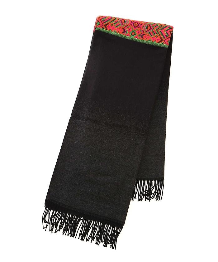 ブラックベースに中央でトライバル柄を切り替えたポンチョ風ストール。ほっこり暖かな風合いでさらっと巻ける秋冬のマストアイテム。無造作にぐるぐる巻いたり、広げて羽織ればポンチョのように使用いただけます。カラフルなトライバル柄がアクセントになり、細いフリンジが軽やかなニュアンスをプラスします。
