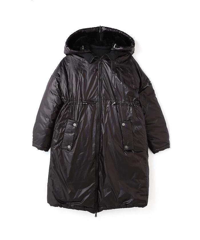 表には光沢がありラグジュアリーに、裏面にはマットなナイロンファブリックを使用しているので全く違った雰囲気での着用が可能。キルティングやステッチが入ってないシンプルなデザインが挑戦しやすく、大きめのフードはジッパーで開閉できるようになっています。フードの内側にはエコファーを使用することで女性らしさやトレンド感をプラス。ウエスト部分はドローストリングで調節可能となっており、シルエットをコクーンの様な丸みのあるシルエットにもできるので、また違った印象に仕上がります。非常にコーディネートしやすく長く着て頂けるデザインです。その日のコーディネートに合わせて自分らしいアレンジを楽しんでいただける商品です。