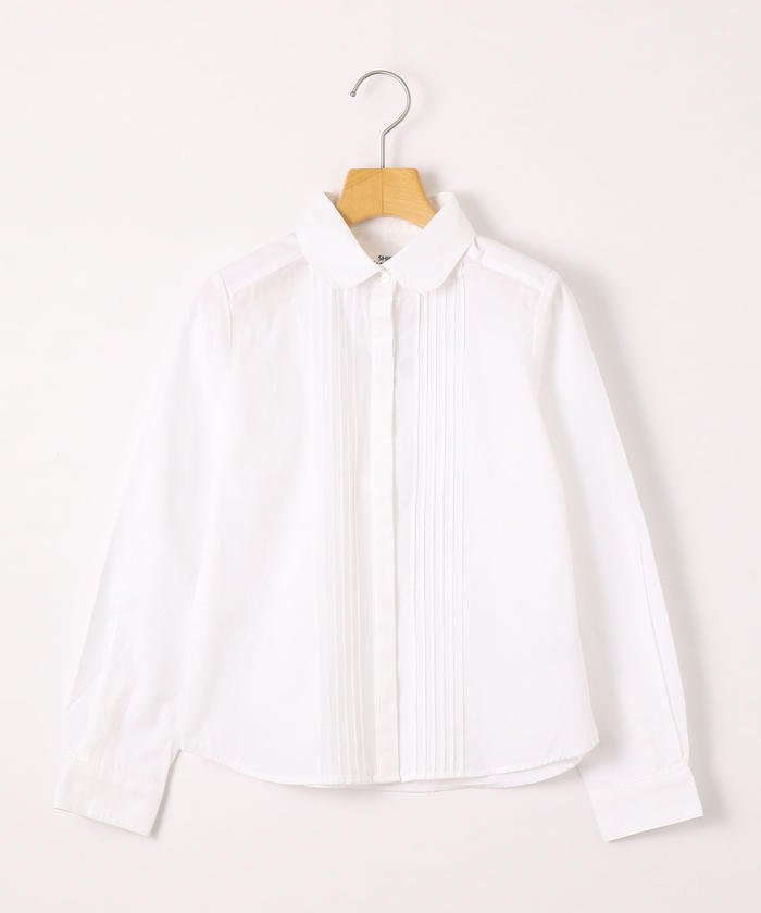 フォーマル仕様のラウンドカラーブラウスです。遠目は無地のホワイトですが、ドット柄になっています。前身タックや後ろ身のギャザーなどもポイントです。入卒学や発表会など、様々なシーンで活躍します。