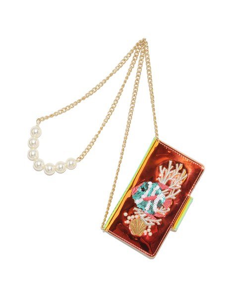 キラキラと輝くミラー素材に、スパンコールやパール、刺繍をあしらった存在感抜群の手帳型ケース。