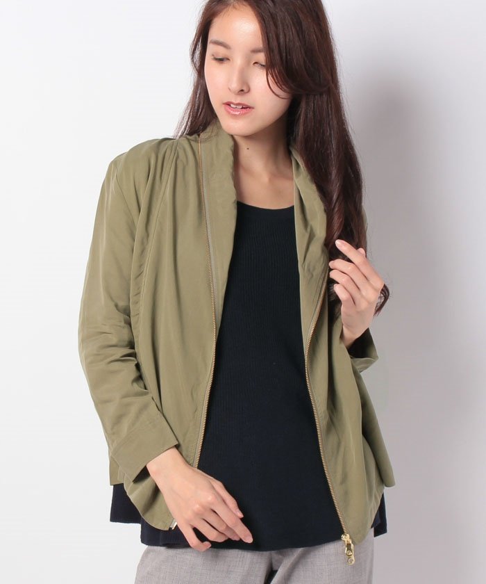 ジップアップショールカラーのブルゾンです。リヨセル混の素材がカジュアルに見えすぎず、よい風合いに仕上がりました。襟の立体的なフォルムとフロントにたっぷりとったドレープで女性らしさを演出。フロントにジップがある事でデザインを引き締めて見せ、袖のロールアップで抜け感のあるデザインにしています。
