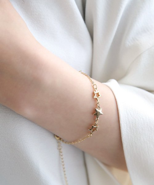 タイプの異なるスターモチーフを連ねたブレスレット。甘さをおさえたスタイリッシュで大人かわいいデザインに仕上げました。アジャスターで調整できるのでお好みのサイズ感でご着用いただけますよ。カジュアルなコーデにもフェミニンなコーデにもマッチする、使い勝手抜群のアイテムです。