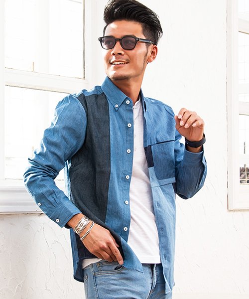 同素材で色違いのデニムを縫い合わせた、旬のブロッキングデザインに仕上がったデニムシャツは、これからの時期に着やすい4.5ozの程よい薄手生地に。