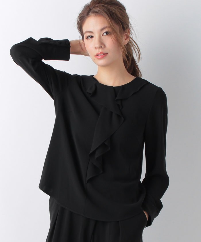 フロントセンター部分のフリルデザインが特徴のセレモニー兼用ブラウス。ポイントのフリルはインしてもフリルが綺麗におさまる様に、またアウトにしても急にフリルが途切れずキレイにフェードアウトするように、こだわりを持ってデザインされています。袖とフリル部分はデザインポイントとして少ししっかり目のシフォン素材を使用。同素材を使用するよりもボテッと重くならず、かといって軽すぎない、セレモニーと喪服に兼用できるためのちょうど良い素材感のシフォンを徹底的に選びました。シーズンとしては1年中着用可能。そして様々なシーンにも活用可能な、まさに無敵のブラウスです。