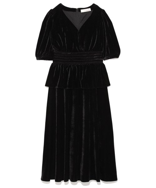 特別な日にもセレクトしたい、豊かな光沢をたたえたベロア地のワンピースです。ボーダー状にリボンを並べたウエストですっきり沿わせて、ふわっとなびくペプラムフリルをより可憐に演出。5分袖と膝丈が肌見せを抑えて、品の良さも感じさせます。