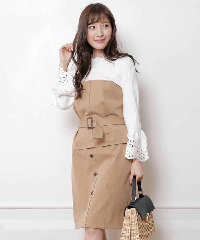 ウエストシェイプしたシルエットを作り、美スタイルで着こなせるビスチェワンピース。フロントボタンが縦ラインを強調し、スタイルアップを演出。インにはリブタートルやカットソーを合わせて。