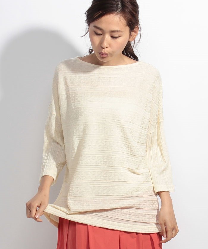 凹凸感のあるジャカード柄で、シンプル過ぎない1枚に仕上げたプルオーバー。すっきりとサイドに開いたボートネックが、顔周りをスマートにまとめます。ヒップまでカバーする長めのレングスで、パンツとの相性も抜群。