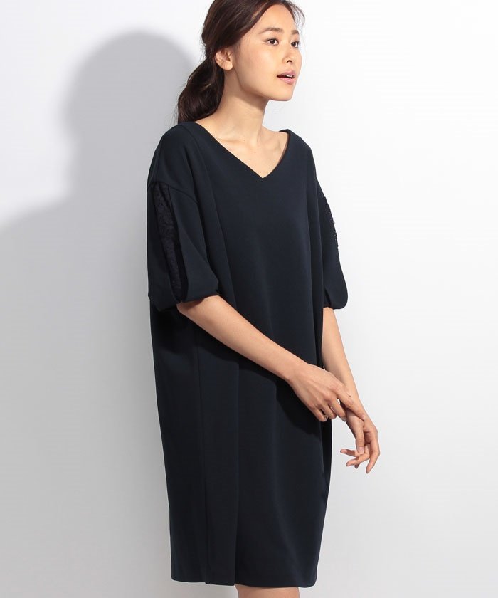 ◆Bou Jeloud(ブージュルード)◆ざっくり着られるビッグシルエットのワンピースです。襟もとは緩やかなカーブのVネック。肩から落ちたゆったりとした着心地のドロップドショルダーになります。フワッとした可愛らしいバルーンな袖口が特徴で、袖の中心部分にレースが施されています。Aラインのシルエットが女性らしいワンピースです。