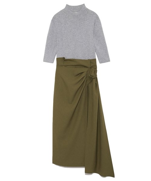 ボトルネックのトップスにラップスカートを組み合わせたコンビワンピース。