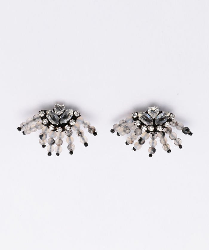 小粒の天然石放射状に連ねた、扇形のようなモチーフが目を惹くイヤリングです。ビジューの煌きを添えてゴージャスに仕上げました。シックな色合いなのでパーティやオケージョンなど華やかなシーンにも対応します。耳に挟むだけなので着脱も簡単です。