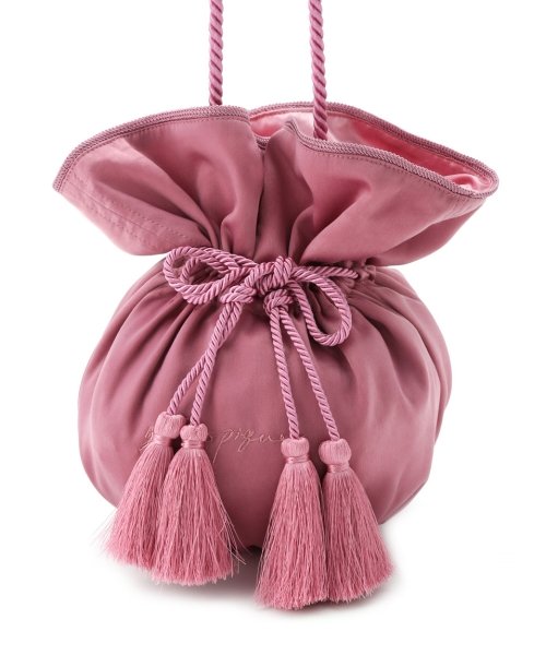 クラシカルな巾着デザインのポーチを、ベロアのようなとろみ感のあるサテン素材を使用してエレガントに昇華させました。リボンやタッセルが、今季のクラシカルな女らしさにマッチします。丸い小ぶりなフォルムは、パーティーシーンなどにも合わせても絵になります。