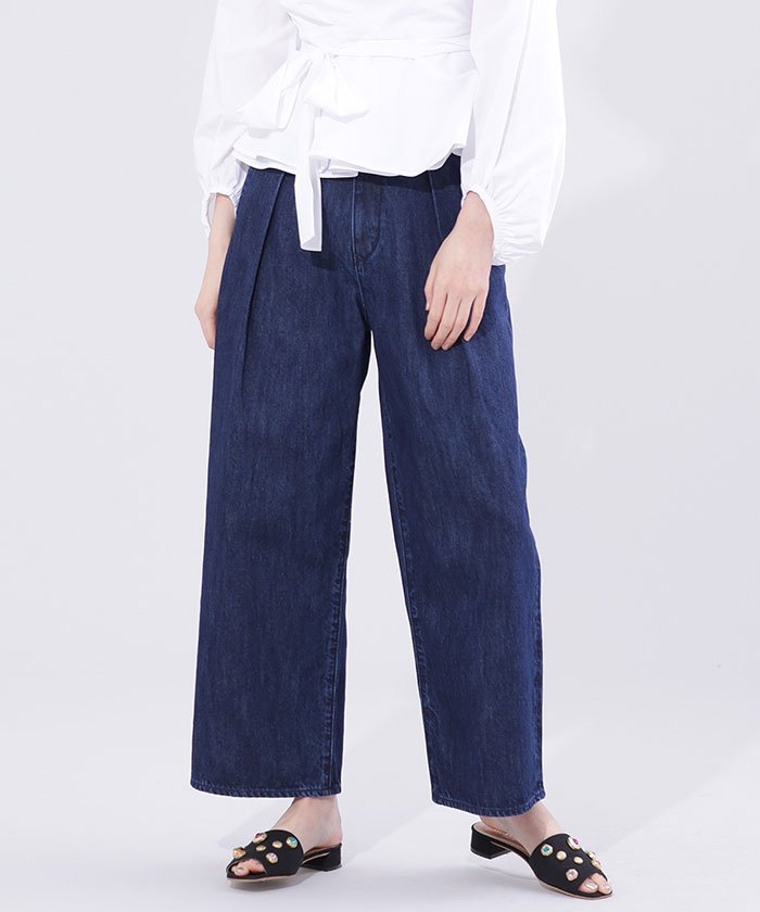 センタータック入りでデニムでもキレイめな印象に仕上がるワイドパンツ。ヒップに入った大きめのポケットが、ヒップ回りがすっきりとした印象にしてくれて小尻に見えるのが嬉しい。タックと程よくハリ感のあるコットン素材でスタイルカバー効果も期待できそう。キレイ色のニットやハリのあるシャツを合わせた大人カジュアルな着こなしがおススメです。