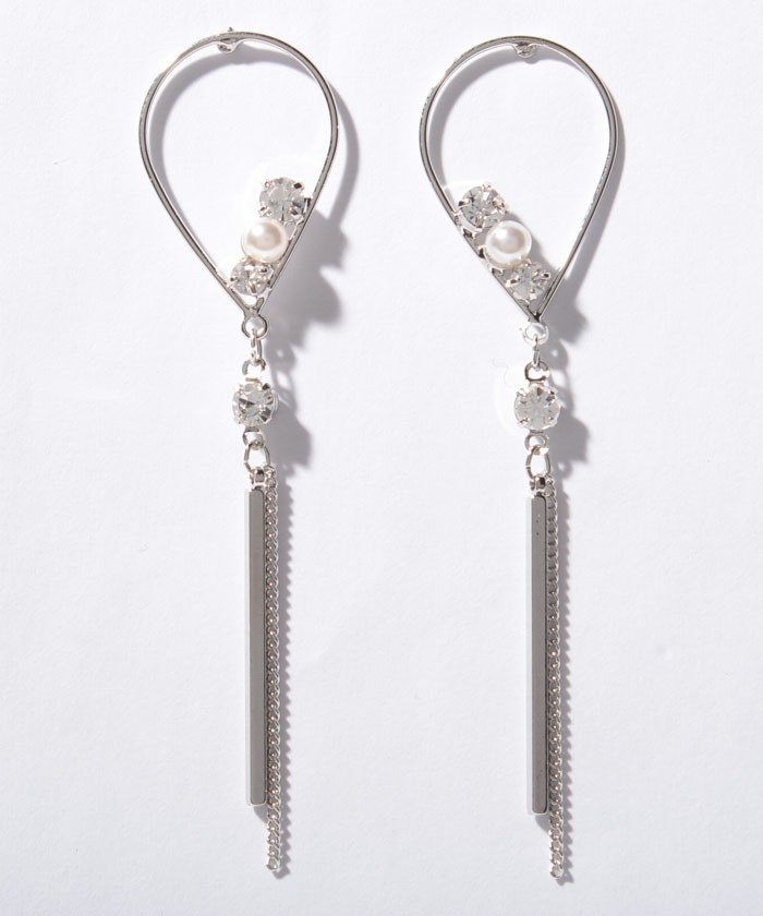 トップのドロップ型サークルにビジューをバランスよくあしらった、フェミニンなピアス。先端で揺れるパー&ロングチェーンがアクセントになってくれるデザイン。シンプルなコーデのアクセントにしたいアイテムです。