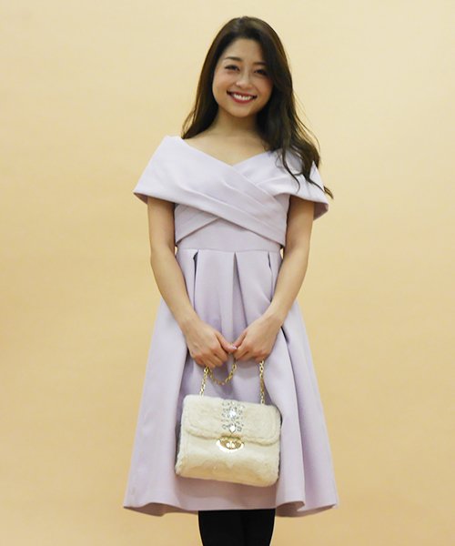 デコルテラインを美しく見せてくれるVネックのオフショルダードレス。開きも浅めなので清楚さも感じる1着に。カシュクールがボディラインを美しくスッキリと見せてくれるのもポイント。スカート部分はふんわりとフェミニンさ漂う王道フレアできまり!