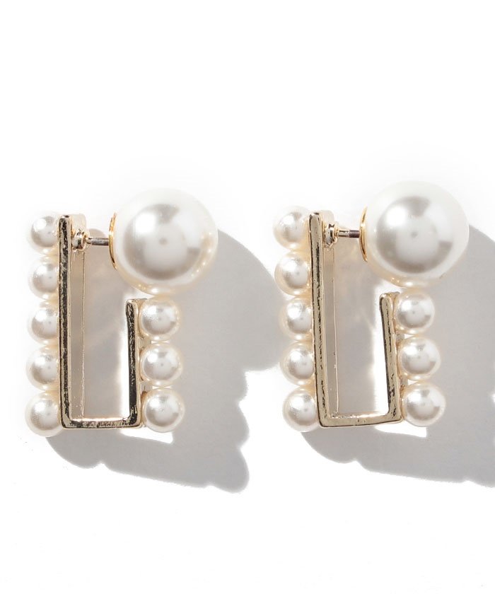 艶やかなパールビーズを使用した、クラシカルモダンに映えるピアス。スクエア状のメタルパーツをベースにしたディテールが新鮮! 耳たぶを挟んだようなルックスで、サイド+バックスタイルも印象的に演出します。