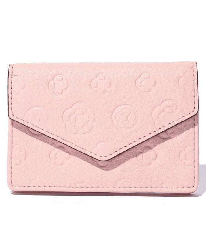 様々なデザインや大きさのカメリアをリアルレザーに型押しで表現したカードケース。フロントにトッピングされたビジューモチーフが、キラキラとリッチに輝きます。すっきり無駄のない収納で機能面も◎。