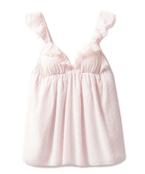ハート柄のシフォンで仕立てた、スウィートムードあふれるキャミソール。アンダーからふわっと広がるドーリーなシルエットによって、女の子らしい着こなしを存分に楽しめます。ストラップや胸元へはフリル・後ろへはリボンをあしらっている、ガーリーなシリーズ。使い勝手の良いカップインも好ポイント。