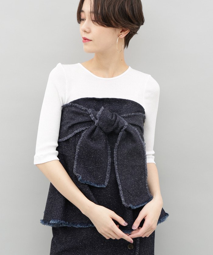 レイヤードのバリエーションを楽しみたいデニムツイードビスチェ今年らしい存在感のあるトップスの着こなしが楽しめるデニムツイードビスチェ。フロントのリボンは見ごろのサイドで繋がっているので着こなしのバランスにあわせアレンジ可能。インディゴ染めのデニムツイードは肉厚でしっかりした素材なので オールシーズン着て頂ける素材です。フリンジ使いがオリエンタルなムードを演出してくれます。リボン部分は着脱可能なため、コーディネートのバランスにあわせてアレンジしていただけます。