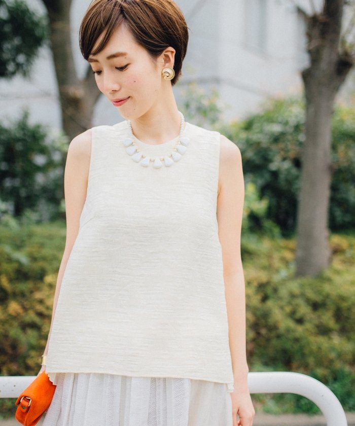 サイドプリーツの切り替えがポイントのトップス。綺麗めパンツやタイトスカートはもちろん、デニムなどでカジュアルダウンしても◎