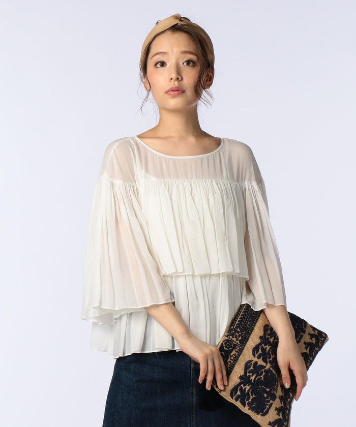 ティアードデザインにたっぷりのギャザーでガーリーに仕上げたブラウス。やや短めの着丈がスタイルにメリハリを演出し、すっきりと着こなしていただけます。ネックは広く開き、フェイスラインがシャープに見えるのも魅力です。肌触りはさらりとして心地よく着られます。