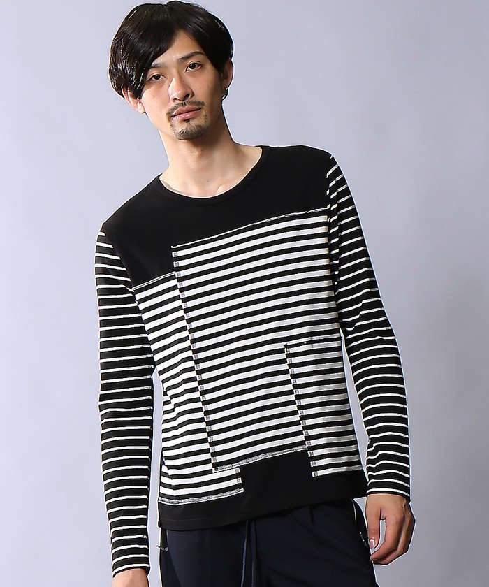 シーズンテーマの“MONTAGE”をインスピレーションに、2パターンのボーダー柄と無地を組み合わせたデザインTシャツです。