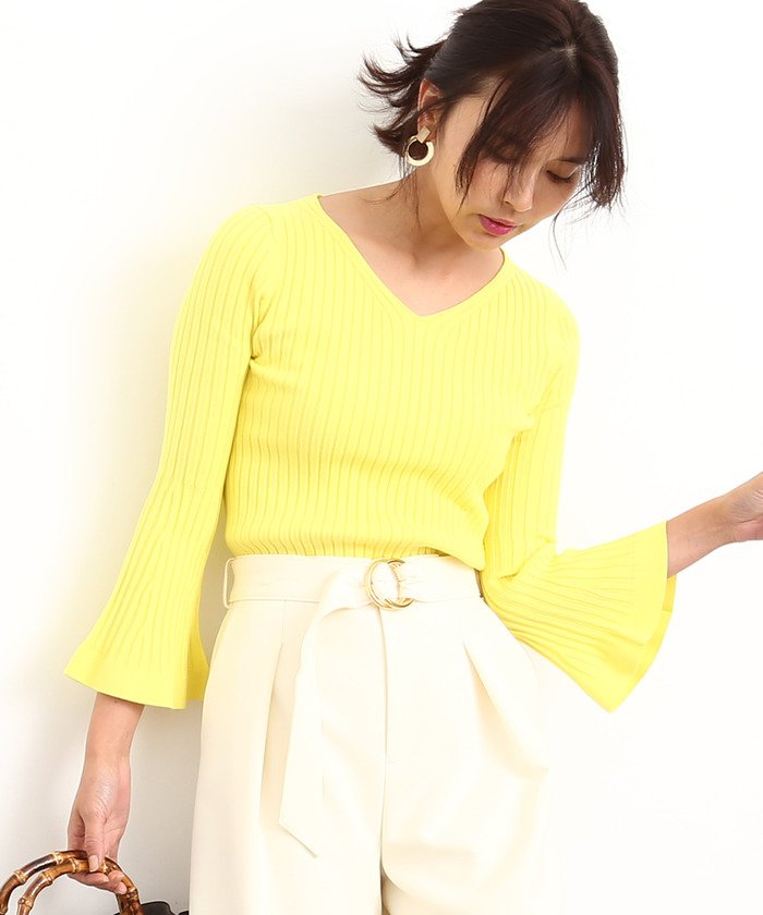 フレアスリーブが華やいだ雰囲気を演出してくれるワイドリブのニットプルオーバー。ひじから編み地を切り替えることで、さりげない表情もプラスしたデザインです。浅Vネックでスッキリ見せつつ、真冬でも寒々しくないように仕上げているのもポイント。発色が良くコートインにしたときも華やかに決まります。細めのパンツからフレアスカートまで幅広いボトムに好相性なので着回しにも大活躍。