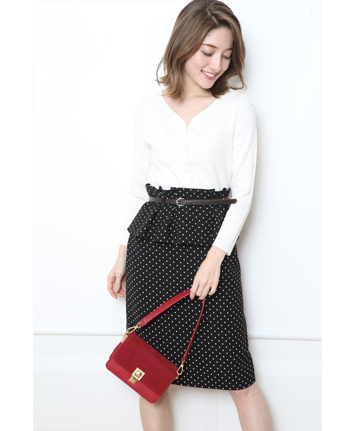 今シーズン注目を集めるドット柄で、大人可愛くトレンドライクなスタイリングが楽しめるタイトスカート。ぺプラム部分は取り外しができるから、気分やトップスに合わせてアレンジするのが◎。セットになったベルトが着こなしを凛と引き締めます。