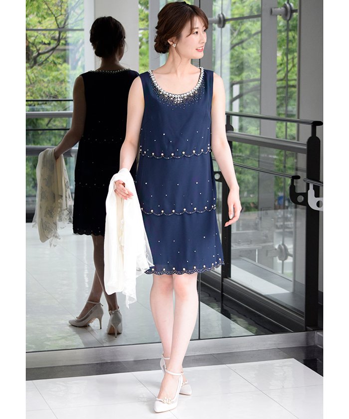 ネックラインやスカラップティアードを飾る、ビジューの装飾が華やかなノースリーブワンピース。ボディラインを拾いすぎないシルエットも上品さのあるアイテムです。
