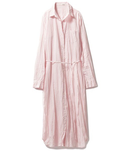 シワ加工が施されたシャツドレス。ストライプ、スター柄と色で柄が違う、遊び心のある大人のルームウェア。前開きにしたりとレイヤードが楽しめる1枚です。