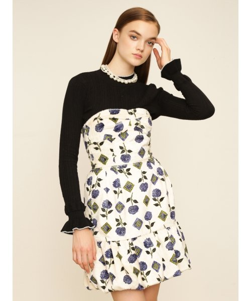 流行のフェイクファー×レトロなロマンティックプリントで、一枚で華やげるベアワンピースを製作しました。裾は、切り替え&チュールを中に入れることで、バルーンのような愛らしいボリューム感が実現。バックスタイルは、レースアップで後ろ姿も女の子らしさを意識しました。